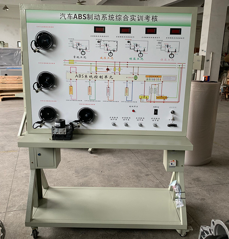 ABS控制單元、ABS電磁閥總成、輪速傳感器、制動開關等。檢測端子、故障設置系統、大容量蓄電池或12V開關電源、大型彩色噴繪電路原理圖、控制面板、可移動臺架、使用說明書及任務驅動式實訓指導書等。