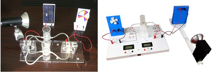 燃料電池教具是利用光線照射在太陽能電池板上產生電能,然后利用產生的電能作用在電解電池模塊上,使水發生電解產生氫氣和氧氣。氫氣和氧氣進入到發電模塊產生電能,帶動風扇轉動。
