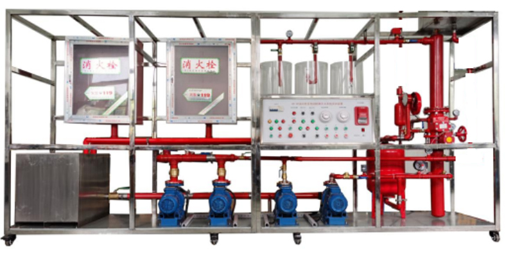 模型框架和水箱等主要部件全部使用不銹鋼器件,保證不生銹、不易老化,模擬大樓噴淋滅火系統;模型系統主要由噴淋水泵、氣壓罐、濕式報警閥、水力警鈴、延時器、壓力開關、水流指示器、封閉式噴頭、試驗閥、火災探測器、火災報警器等典型噴水滅火設備構成,能生動模擬大樓內水滅火系統的典型結構。
