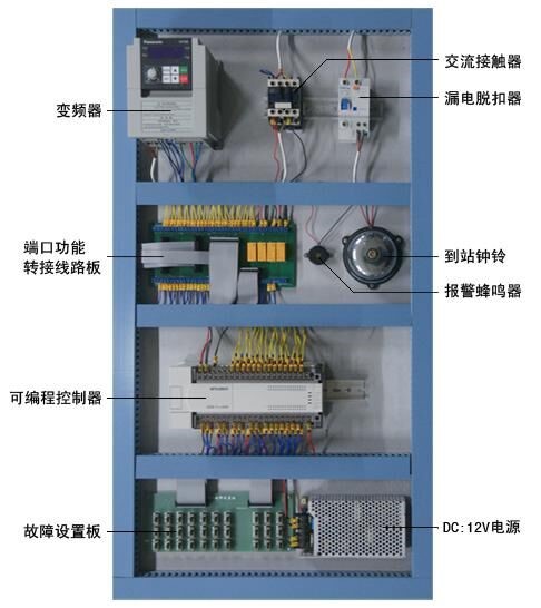 3.電氣控制部分:電源空氣開關(漏電脫扣器)、DC12V驅動電源、PLC可編程控制器、接線端口電路板、到站鐘等。